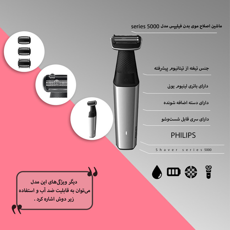 دارای تیغههای فویلیدارای شانه های ۳ و ۵ و ۷ میلیمترباتری لیتیوم یونیطراحی دسته ارگونومیک بلند برای اصلاح محلهای دور از دسترس